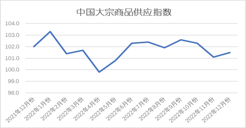 2022年12月份,大宗商品供應(yīng)指數(shù)止跌回升至101.5%,較上月回升0.4個百分點(diǎn),顯示商品供應(yīng)增速加快。從市場情況來看,本月大宗商品價格整體低迷,生產(chǎn)企業(yè)利潤收窄,普遍虧損,但預(yù)期節(jié)前消費(fèi)端備貨增加,部分商品生產(chǎn)企業(yè)生產(chǎn)熱情依然高漲,導(dǎo)致市場供應(yīng)壓力加大。從各主要商品來看,除鋼鐵和汽車外,其余品種供應(yīng)量均呈現(xiàn)增長態(tài)勢。