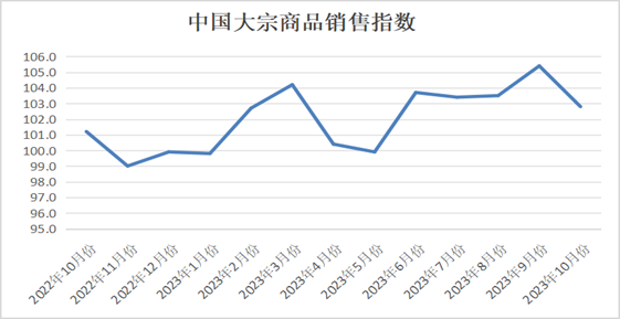 2023年10月份,大宗商品銷售指數結束之前的兩連升,出現回調,當月較上月回落2.6個百分點,至102.8%,顯示國內大宗商品市場在“金九”表現良好之后,“銀十”有所走弱,本月市場銷售增速出現減緩。這主要是:首先,雖然國內經濟仍在溫和復蘇,但房地產行業的拉動作用在減弱,需求未能呈現爆發性增長,基建項目推進也有所放緩,特別是房地產消費市場陷入冰點,市場信心略顯不足;其次,市場價格高位下行,也抑制了投機需求的釋放,終端需求企業也以消耗庫存為主,備貨需求不高;最后,隨著三季度以來,市場銷售量持續增加,基數較高,本月增速減緩也屬正常回歸。各主要商品中,除煤炭銷售量有所減少外,其余品種仍呈現增加態勢,但除鋼鐵外,其他品種銷售增速均有所放緩。