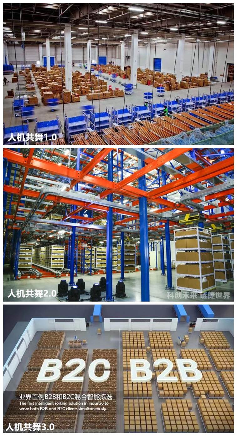 “人機共舞3.0”通過智能化的算法實現(xiàn)了B2B和B2C并行混合的業(yè)務模式、AGV復用、存儲區(qū)無人化等業(yè)界創(chuàng)新倉儲解決方案。